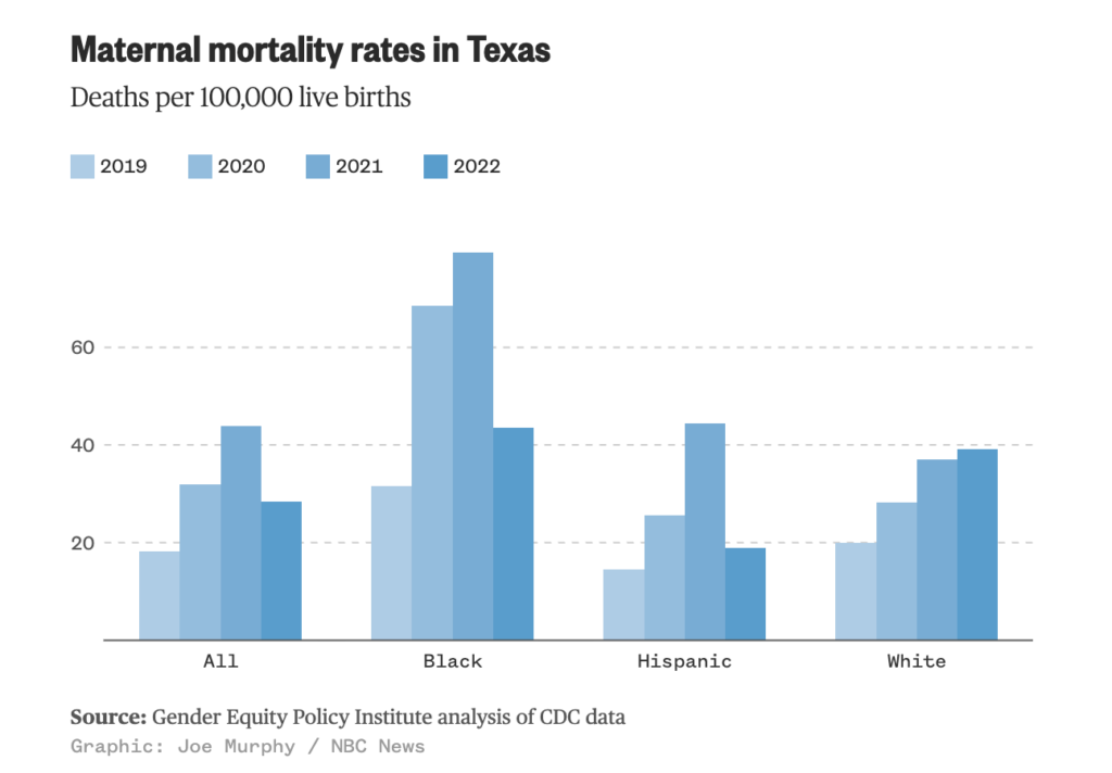 Several studies have concluded that Texas is one of the deadliest places in the U.S. for Black people to give birth. The maternal health complications throughout Black people’s pregnancy have and continue to be fatal – Black people are three times more likely to experience a pregnancy-related death than white people – 80% of which are preventable.